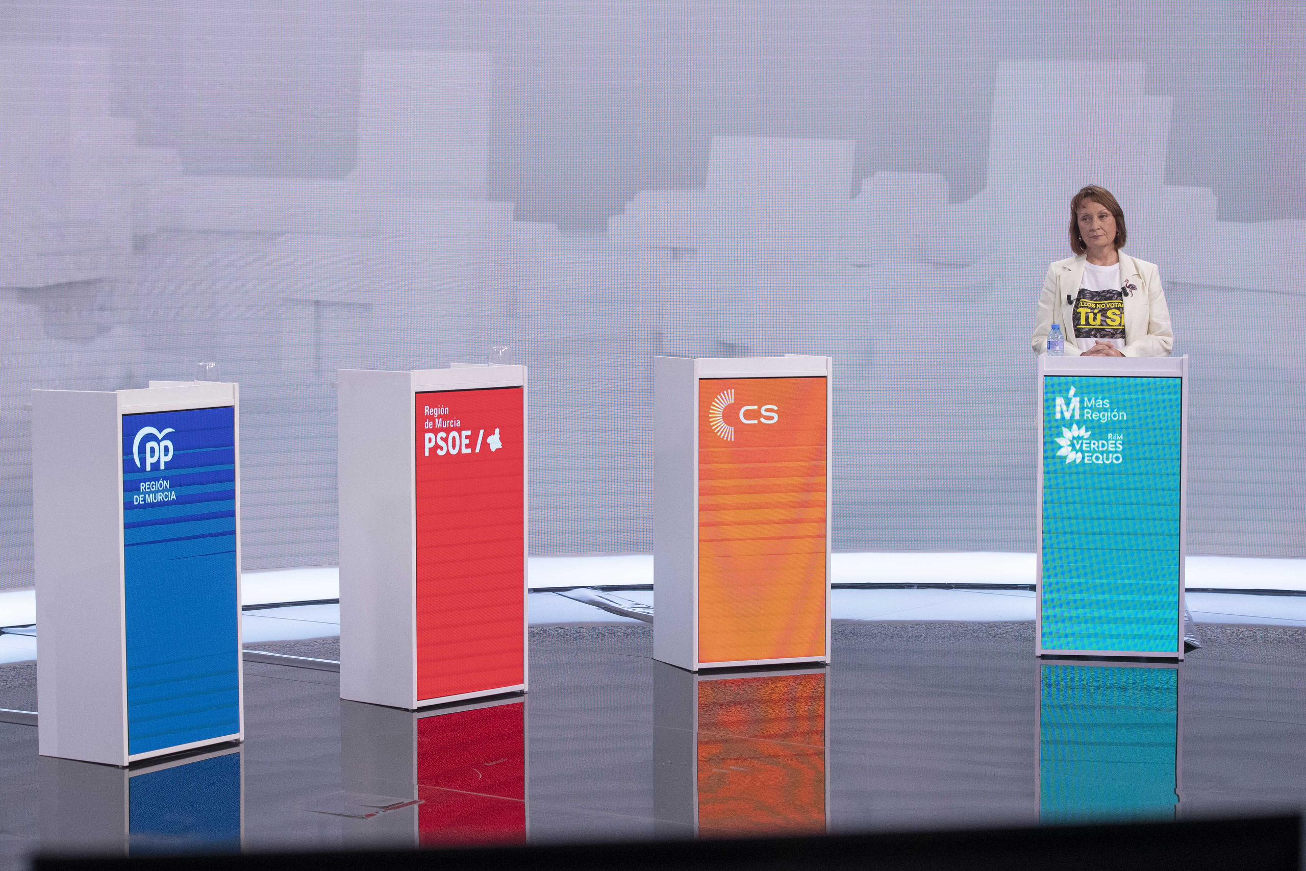 Podemos ha obligado a suspender el único debate electoral en el que iban a participar los candidatos a presidir la Región de Murcia. La candidata morada, María Marín, se negó a abandonar su atril para dejar su puesto a la candidata de Más Región (Helena Vidal) durante la segunda parte del debate, tal y como había ordenado la Junta Electoral Central.