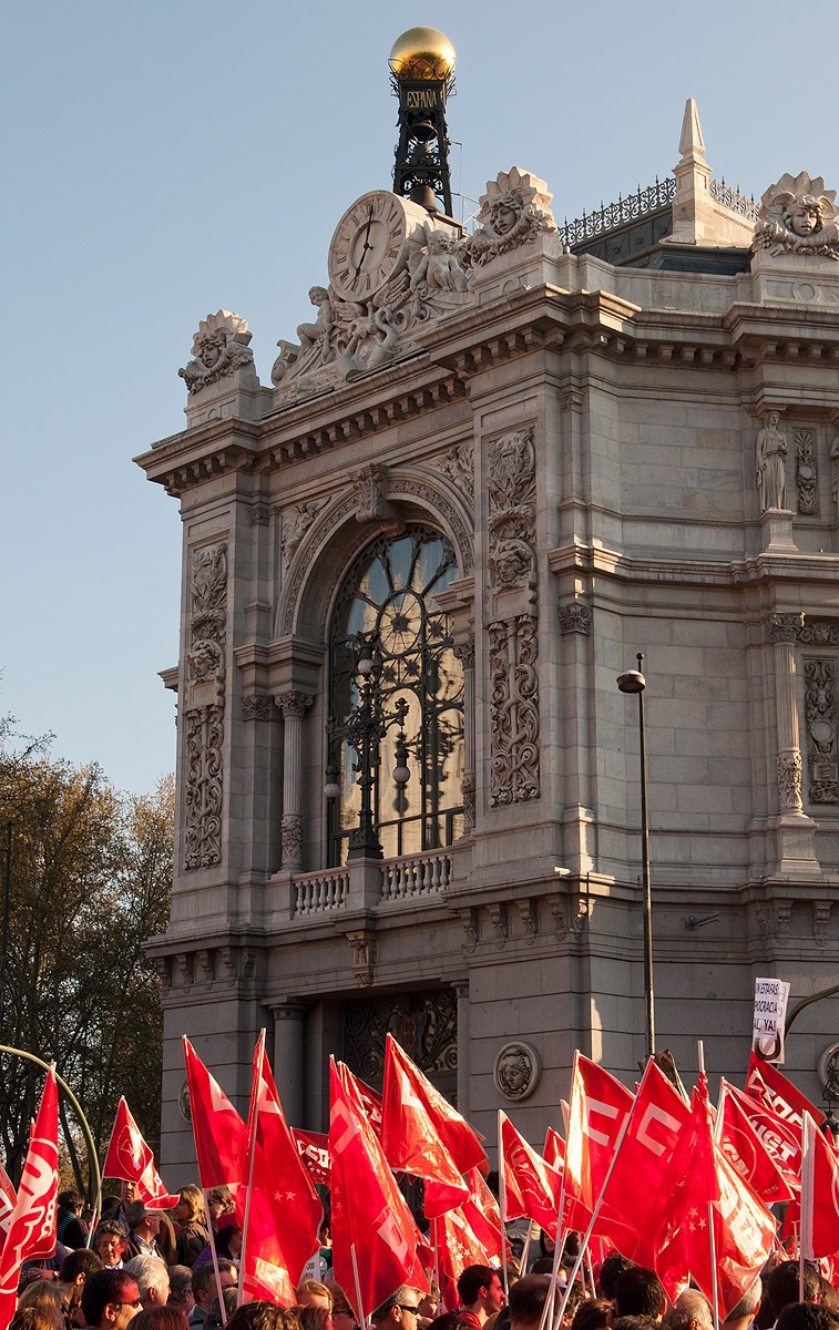 Las banderas de los sindicatos ante la sede del Banco de España.