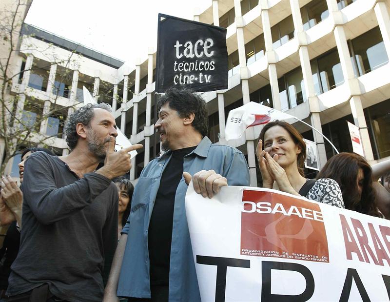 El director de cine Benito Zambrano (i) y la actriz Marisa Paredes durante la concentración contra la Reforma Laboral organizada por los actores.