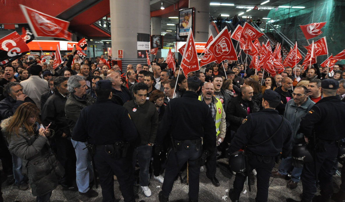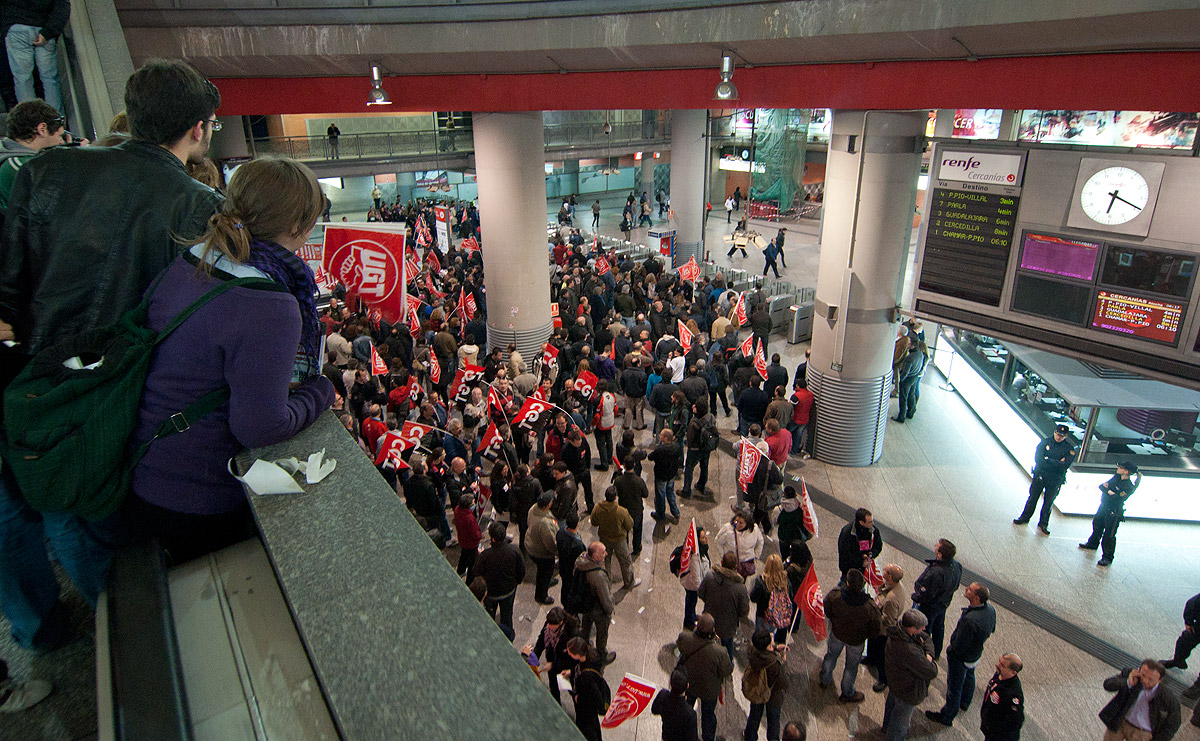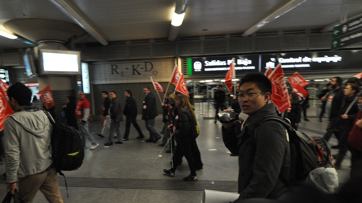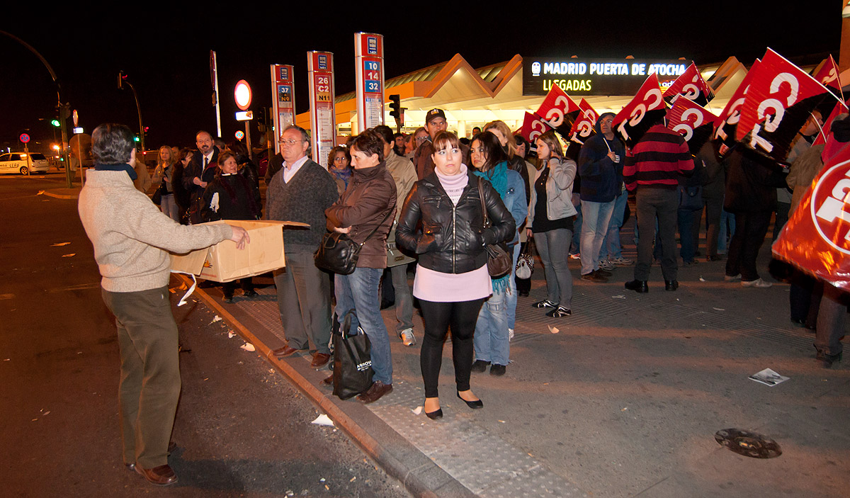 Trabajadores junto a los piquetes en Atocha, mirando de reojo y un tanto intimidados. Un sindicalista simpático les ha ofrecido bocadillos, pero nadie ha aceptado