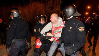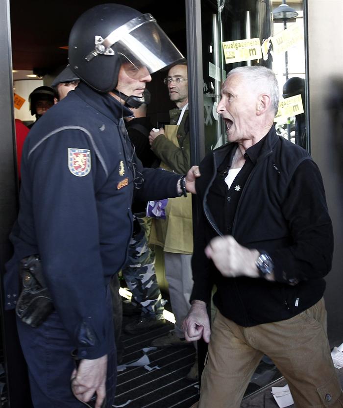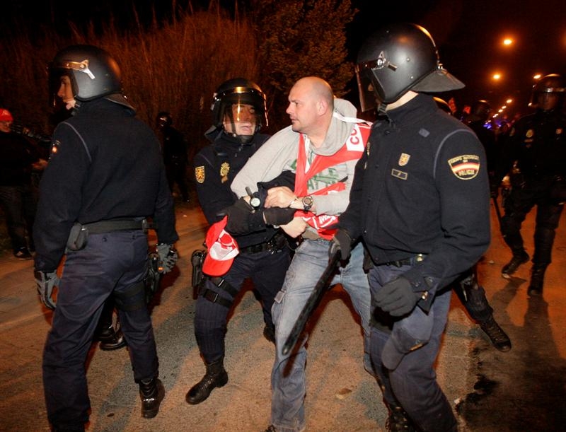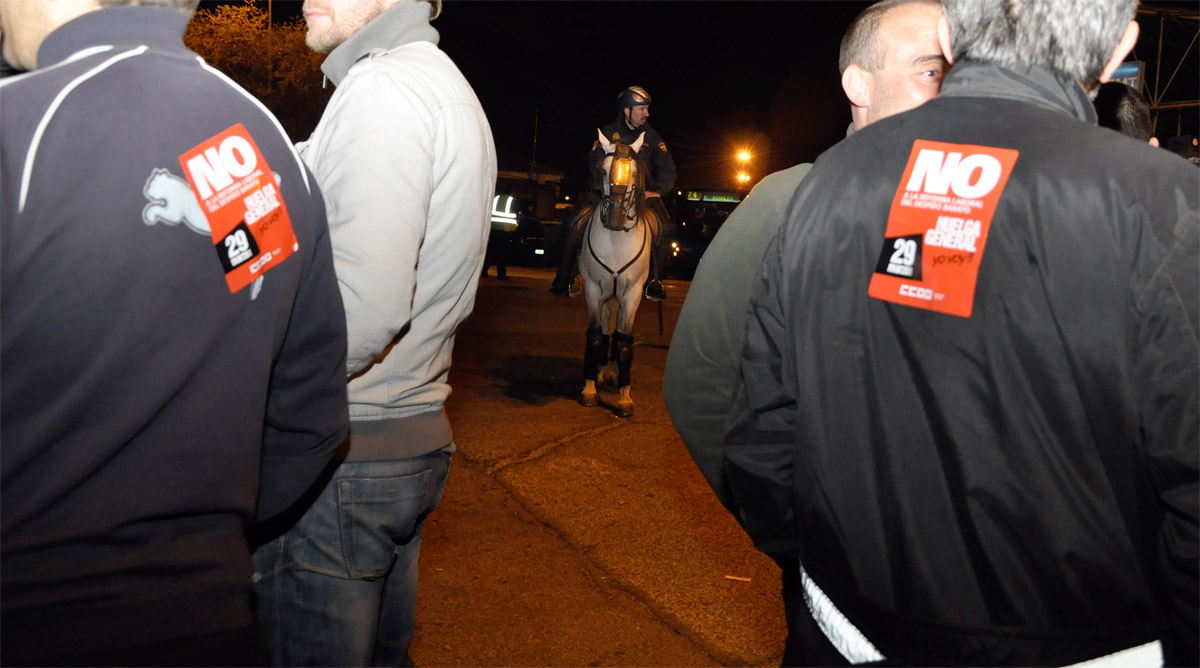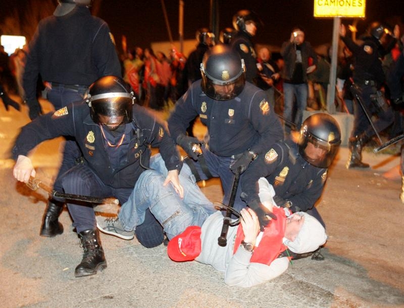 Efectivos de la Policía nacional detienen al secretario general de la Federación de Sanidad y Sectores Sociosanitarios de Comisiones Obreras (FSS-CC.OO.) de Aragón, Juan Urdaniz, durante los incidentes que se produjeron a la entrada de Mercazaragoza cuando los piquetes increparon un camion en la entrada del recinto en la huelga