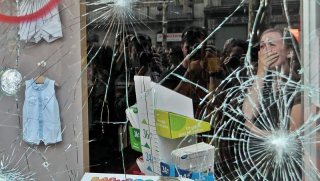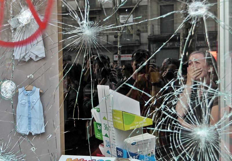 Una mujer llora tras un escaparate apedreado tras ser asaltada su tienda en el centro de Barcelona