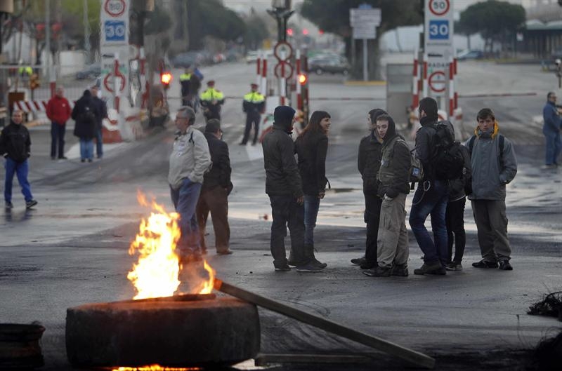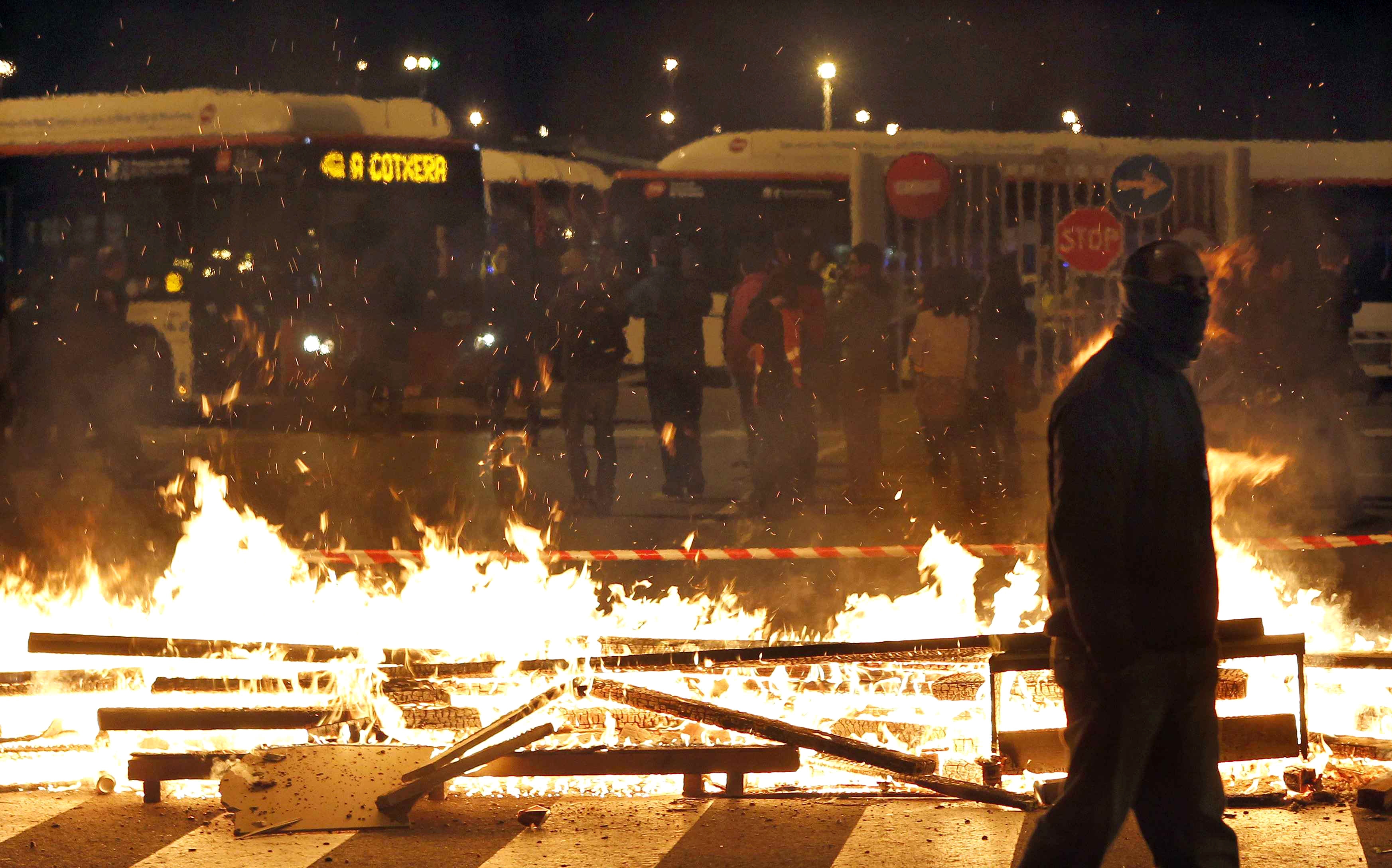 Grupos de piquetes incendiaron una barricada frente a las cocheras de Transportes Metropolitanos de Barcelona en la Zona Franca de Barcelona a primeras horas de la jornada de huelga general, convocada por los sindicatos, en protesta por la reforma laboral aprobada por el Gobierno. EFE
