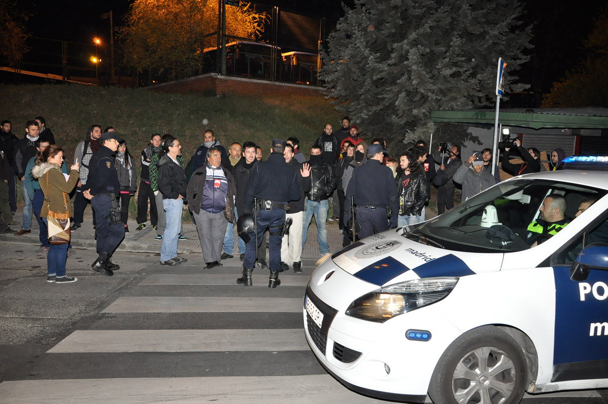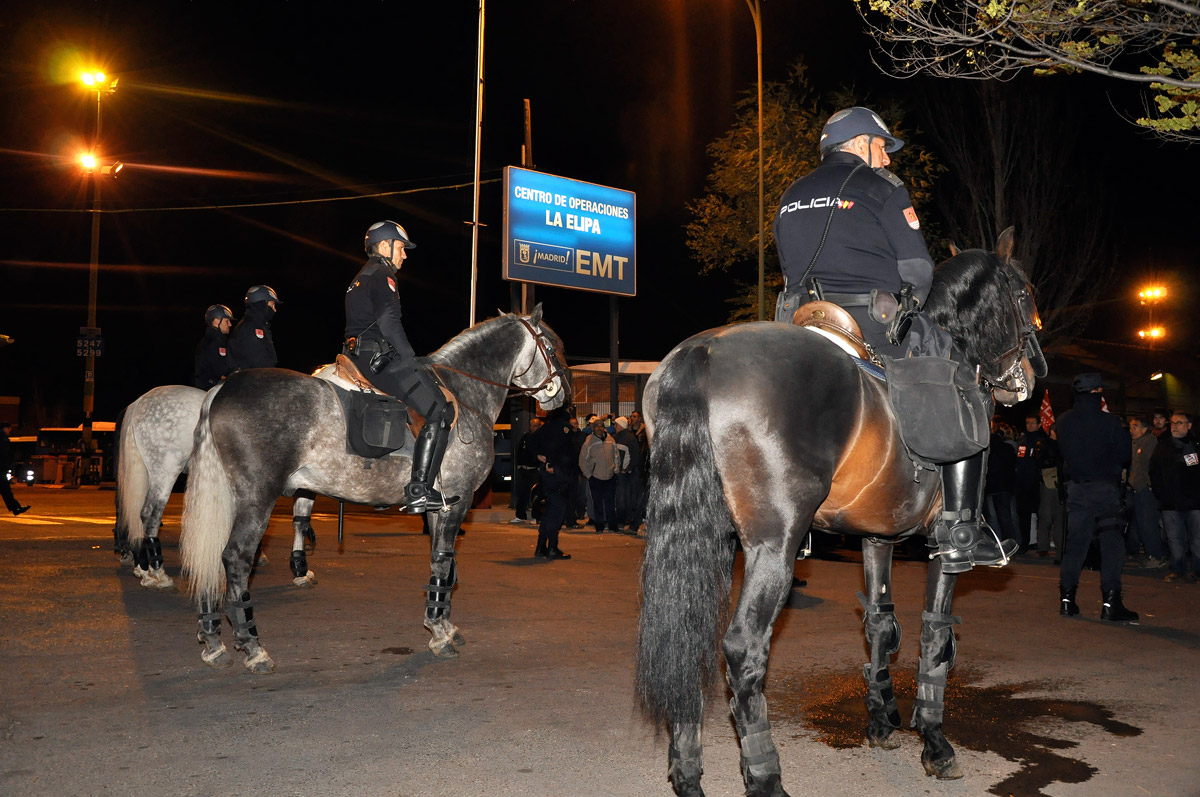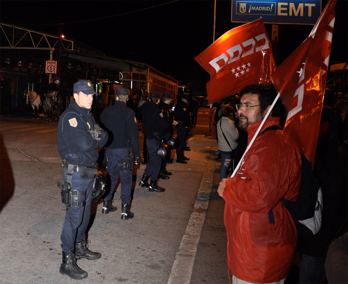 Un fuerte dispositivo policial protegía uno de los centros de operaciones de los autobuses de la EMT en la capital de España.