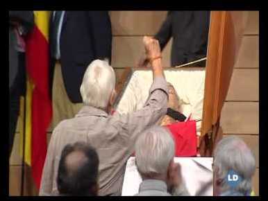 Despedida nostálgica al que fue líder del Partido Comunista, Santiago Carrillo, en la capilla ardiente instalada en el Auditorio Marcelino Camacho de CCOO en Madrid.