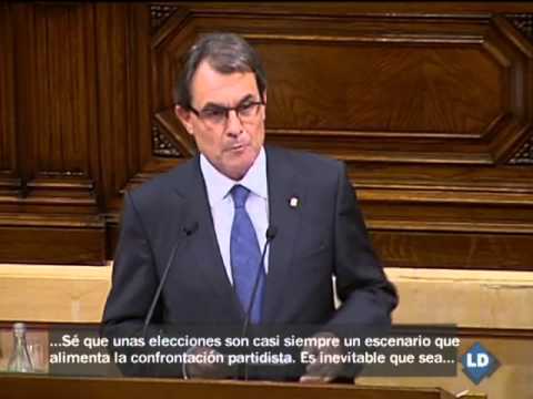 Artur Mas, presidente de la Generalidad de Cataluña: "Consciente de esta realidad, tras constatar en el reciente encuentro con el presidente del Gobierno español que no hay voluntad de avanzar en la propuesta de Pacto Fiscal que este mismo Parlamento votó por una holgada mayoría el pasado mes de julio, y después de unos días de reflexión personal, me he reunido esta mañana con la Presidenta del Parlamento y con el Gobierno y los he anunciado mi decisión de disolver el Parlamento de Cataluña los próximos días y convocar elecciones el próximo domingo 25 de noviembre. En momentos excepcionales, decisiones excepcionales".