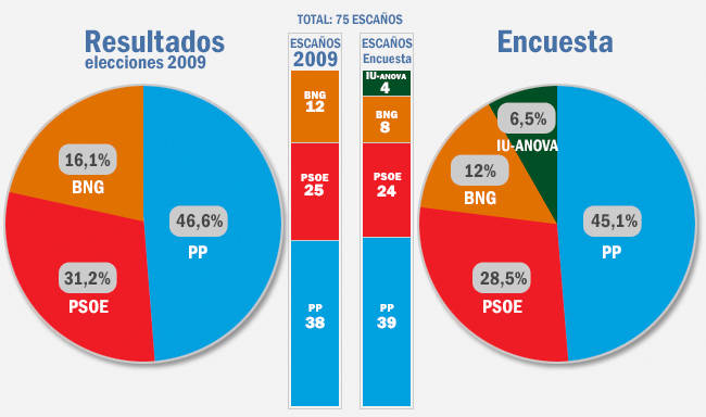 De hecho, la horquilla de los populares se eleva hasta los 41 escaños, un resultado que el PP no obtenía desde los tiempos de Manuel Fraga. Para lograrlo, Alberto Núñez Feijóo superaría ligeramente el 45% de los votos, algo menos de lo que tuvo en la convocatoria de marzo de 2009, pero se beneficiaría de los malos resultados de sus rivales.
