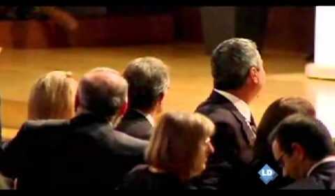 Durante el acto de aniversario el presidente de la Generalitat, Artur Mas ha seguido los consejos de un entrenador dando masajes a sus compañeros de butaca, hinchando un globo o bailando al ritmo de la música.