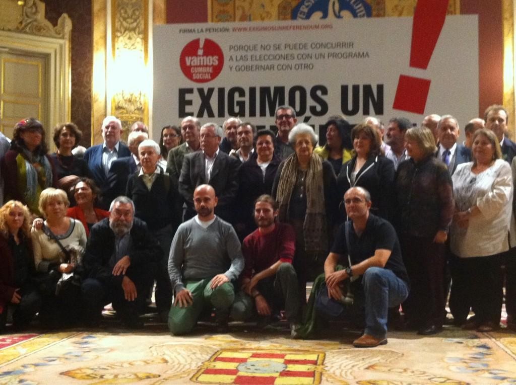 "Porque no se puede concurrir a las elecciones con un programa electoral y gobernar con otro". Este es el lema elegido por la recién creada ‘Comisión Promotora del Referéndum’, que aglutina a lo más granado de la izquierda patria, y que ha sido presentada en sociedad este lunes en el Paraninfo de la Universidad Complutense de Madrid. Desde esta plataforma se exige al presidente del Gobierno la convocatoria de un referéndum –el mismo que ya pedían los representantes sindicales, Cándido Méndez e Ignacio Fernández Toxo hace ya algunos meses– para preguntar a los españoles si están de acuerdo con los ajustes y recortes.