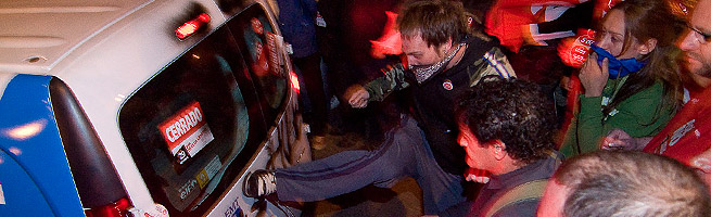 Los enfrentamientos con la policía fueron numerosos pero lo peor fue el ataque brutal a una pequeña furgoneta en la que varios trabajadores salían del centro de trabajo: zarandeos, pintadas, patadas, rotura de todo lo fácilmente rompible... y todo contra sus propios compañeros.