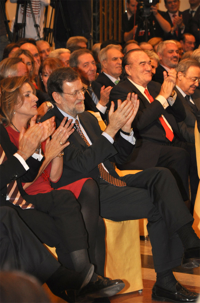 La esposa del expresidente Aznar, Ana Botella, actual alcaldesa de Madrid y el presidente del Gobierno, Mariano Rajoy, aplauden durante la presentación del libro, junto a un muy sonriente Fernando Fernández Tapias.