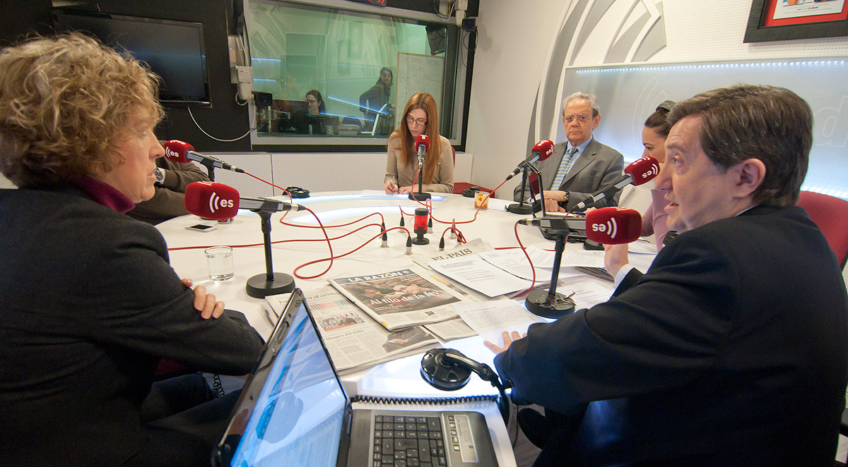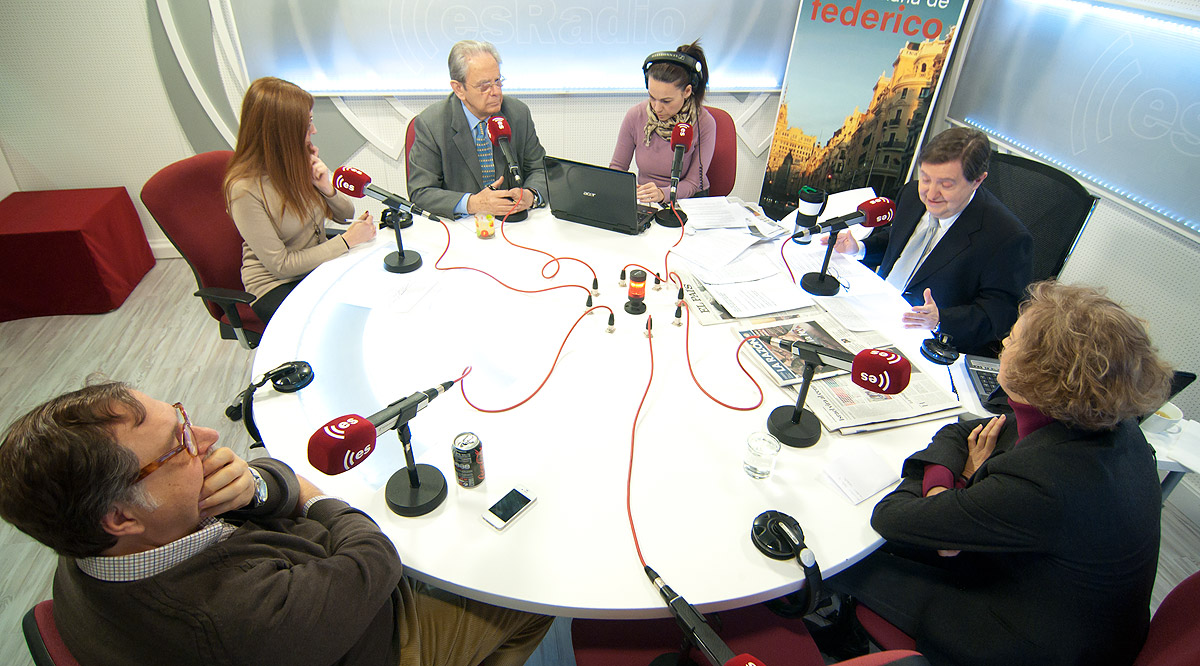 La mesa de la tertulia con Luis Herrero, Vanesa Vallecillo, José Raga, Rosana Laviada, Federico Jiménez Losantos y Ana Iribar
