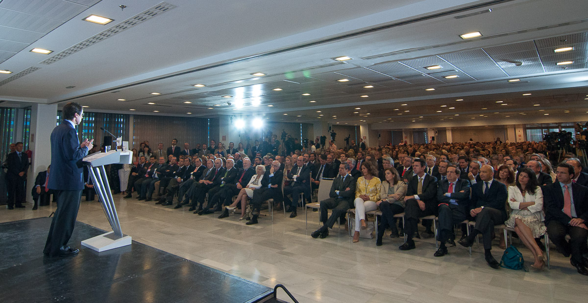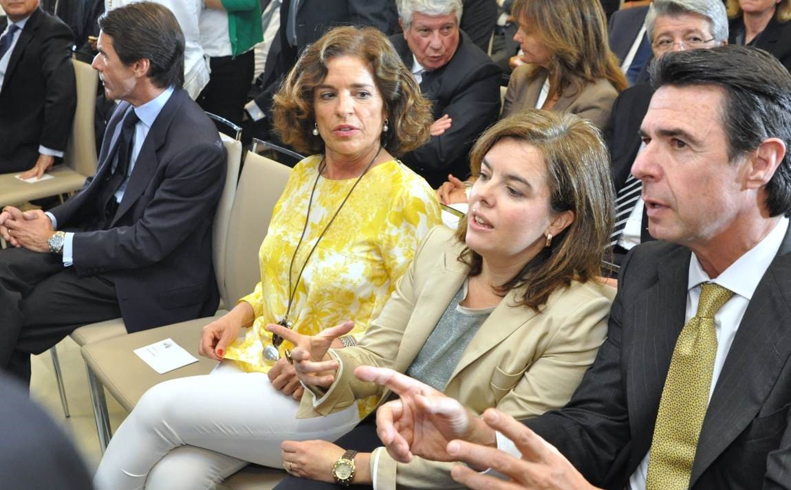 Ana Botella, Soraya y Soria en primera fila, con José María Aznar al fondo