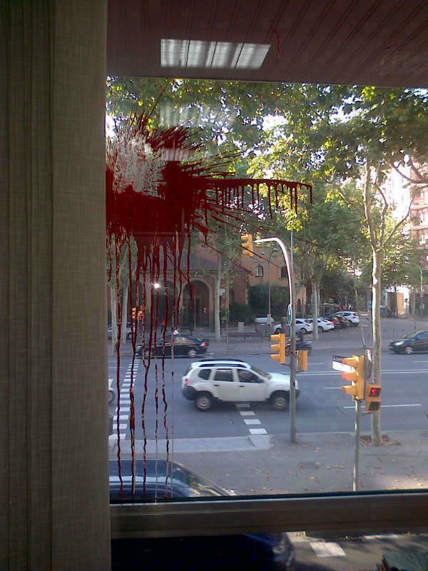 La sede de Ciutadans en Barcelona amanecía esta mañana con grandes manchas de pintura roja en sus cristaleras, sin ningún texto.
