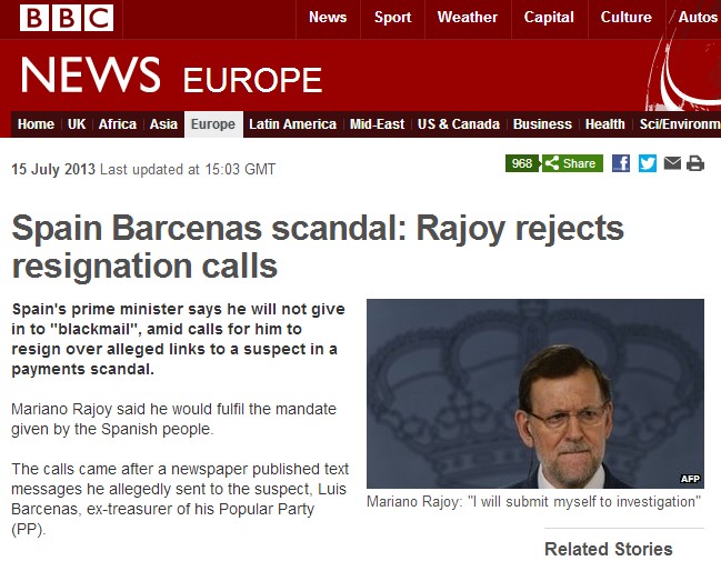 La BBC muestra al presidente español titulando: "Escándalo Bárcenas en España: Rajoy rechaza las peticiones de dimisión", hace referencia a la financiación ilegal del partido y publica otro artículo con una imagen de los "papeles de Bárcenas" y una explicación explicando su contenido .