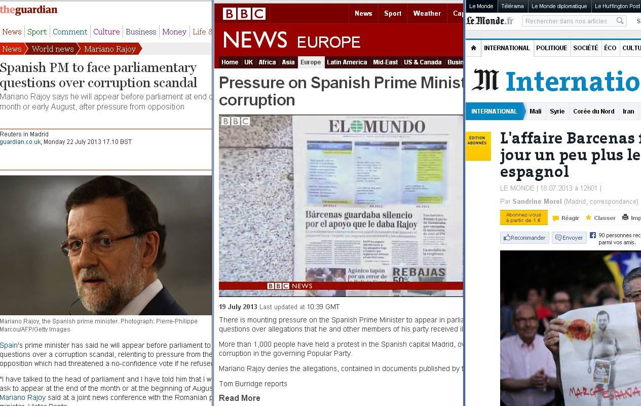 La noticia era rebotada a los pocos minutos por medios como Fox News o la iraní PressTV. El prestigioso diario británico The Guardian utilizaba un título similar para decir que Rajoy comparecerá ante el Congreso. Del Támesis al Río La Plata. En Argentina, el diario Clarin ponía este lunes el anuncio de la comparecencia de Rajoy, como una de las más destacadas de internacional. También informaba sobre la encuesta de El Mundo en la que el 55% de los españoles afirman que Rajoy debería dimitir.