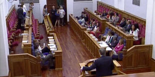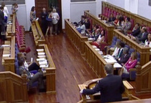 cumple su promesa y reduce el número de diputados. El PSOE contesta al grito de "pucherazo" y se marcha del pleno.