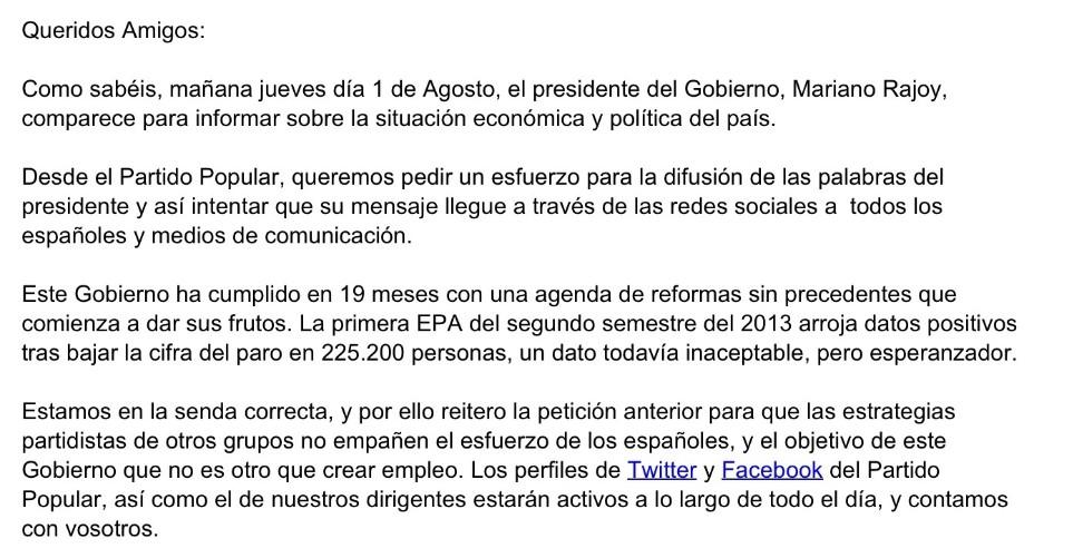 Precisamente, Floriano mandó un e-mail a cargos populares de toda España para reclamar "un esfuerzo" en la difusión de las palabras del jefe del Ejecutivo. "Los perfiles de Twitter y Facebook del PP, así como el de nuestros dirigentes, estarán activos a lo largo de todo el día, y contamos con vosotros", enfatiza Floriano, que concluye su e-mail con la frase "nos leemos mañana".