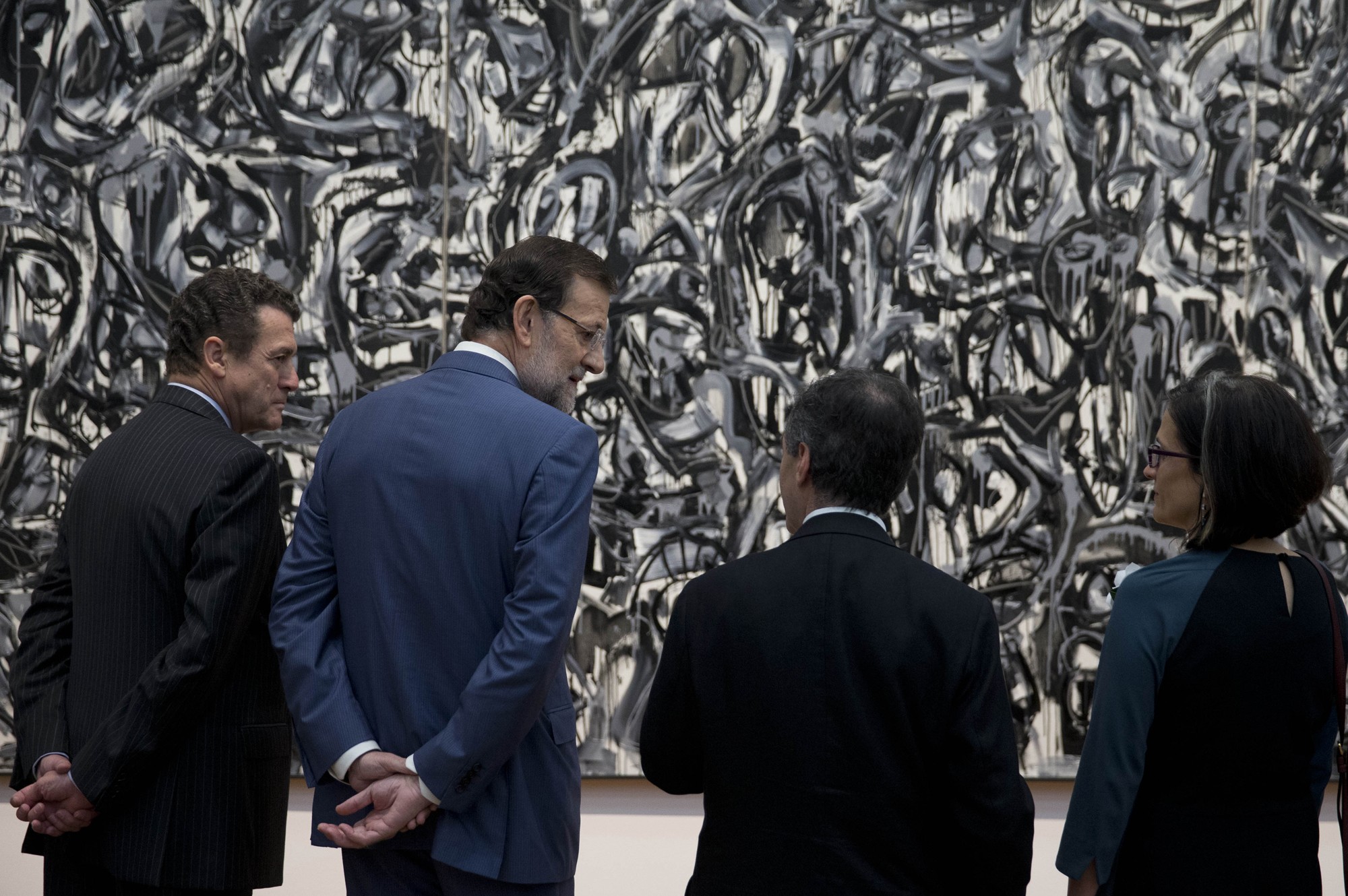 El Presidente del Gobierno, Mariano Rajoy, durante su visita a la exposición "Dentro y fuera, las dos caras del informalismo español" en Tokio.