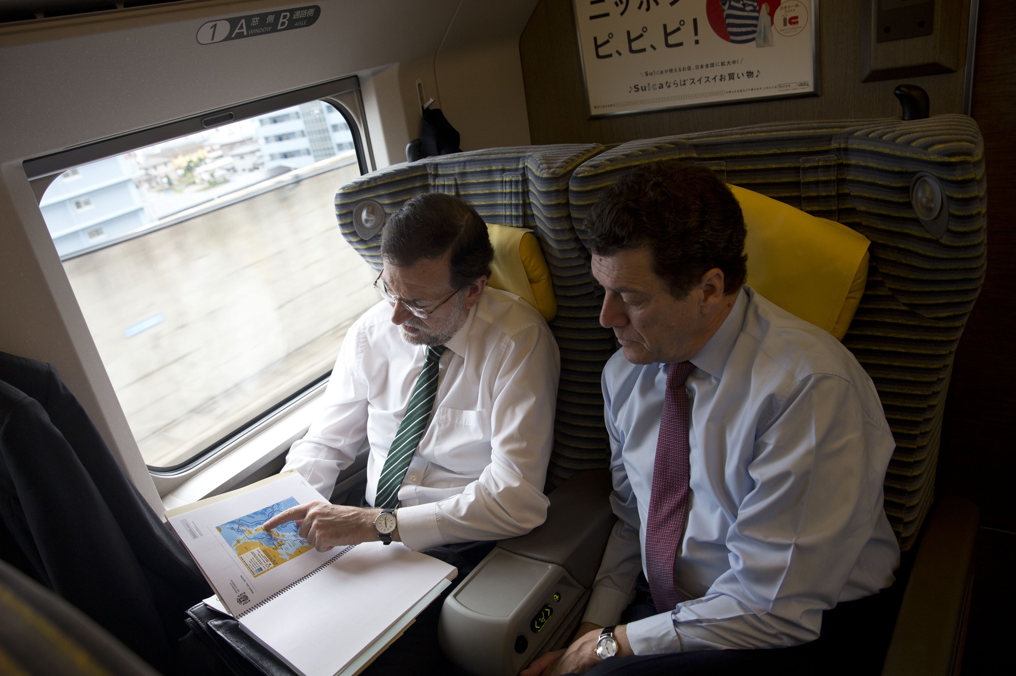 El presidente del Gobierno, Mariano Rajoy, durante su viaje en un tren bala a Fukushima.