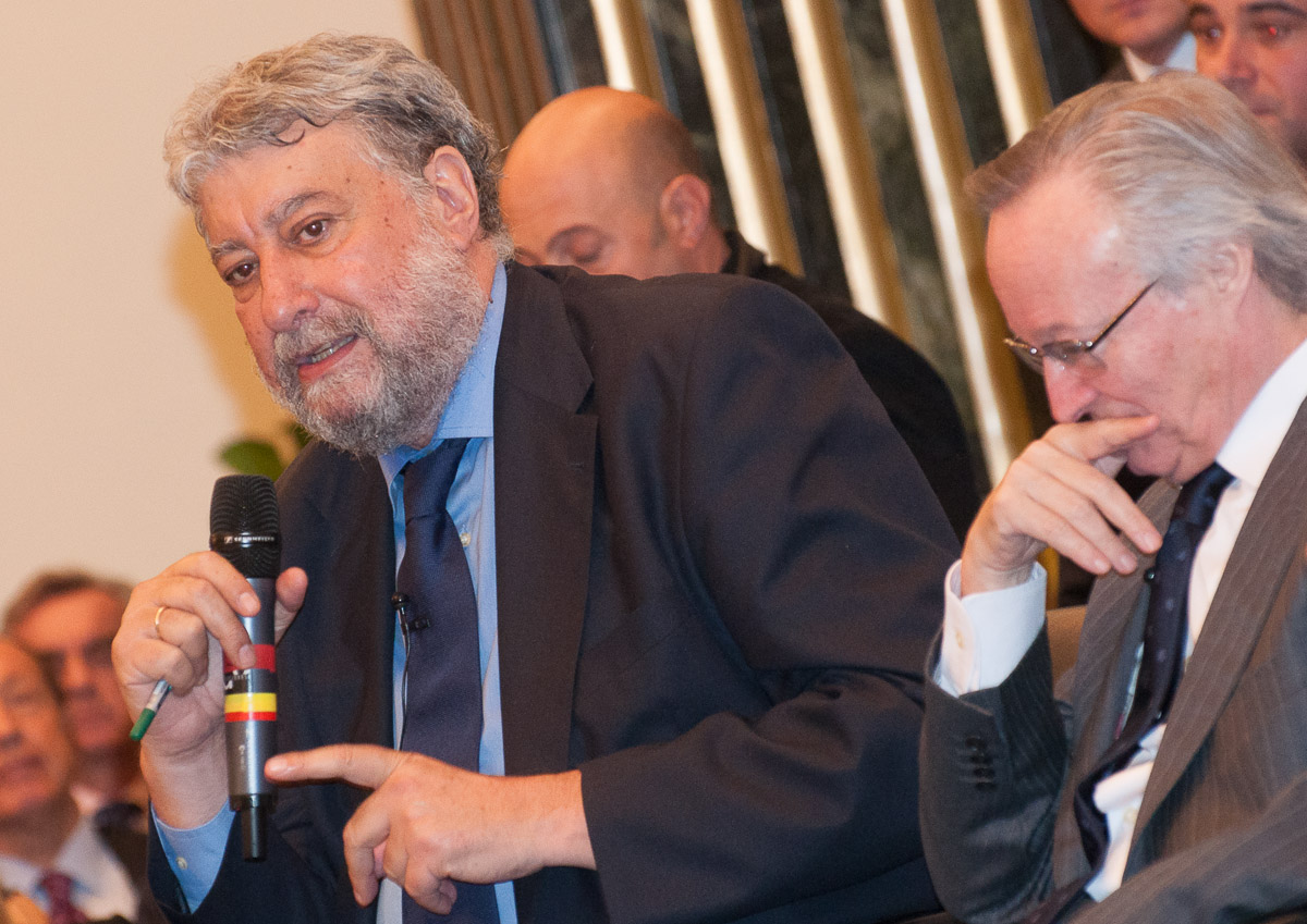 Dos exministros de Interior conversan poco antes de empezar el acto