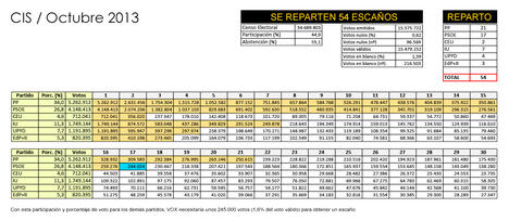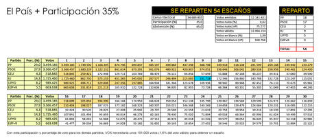 En este supuesto se han extrapolado los resultados de las distintas formaciones en las pasadas Elecciones Generales en el total nacional. En participación, votos blancos y nulos, nos basamos en la cifra de las últimas europeas.