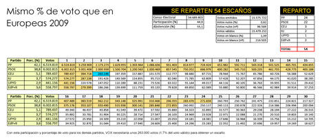 Con todos estos requisitos, el nuevo partido de Santiago Abascal, Vox, necesitaría unos 260.000 votos para obtener un escaño en el Parlamento Europeo (es imposible dar la cifra con total exactitud, entre otras cosas porque habría que saber a qué partidos les robará Vox sus electores).