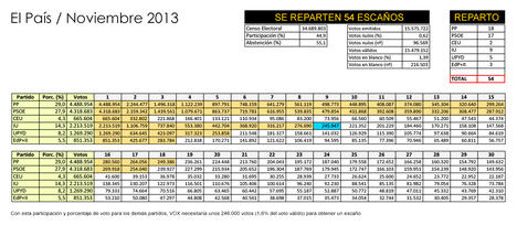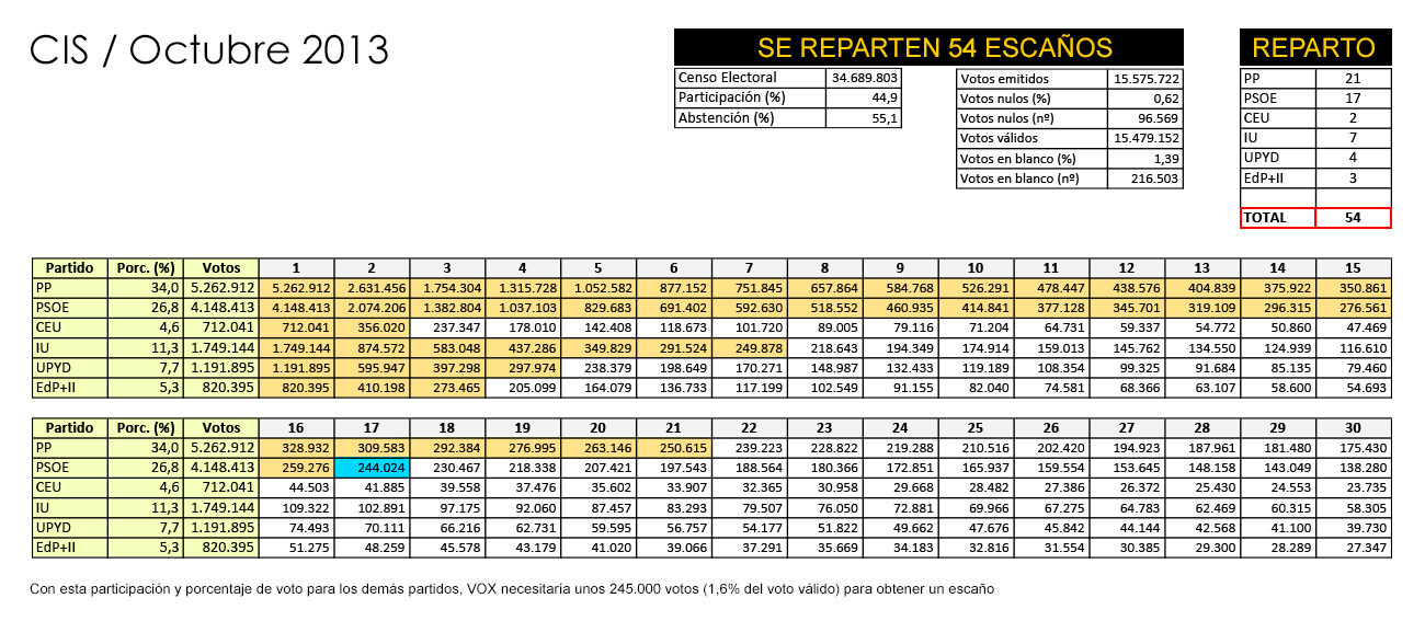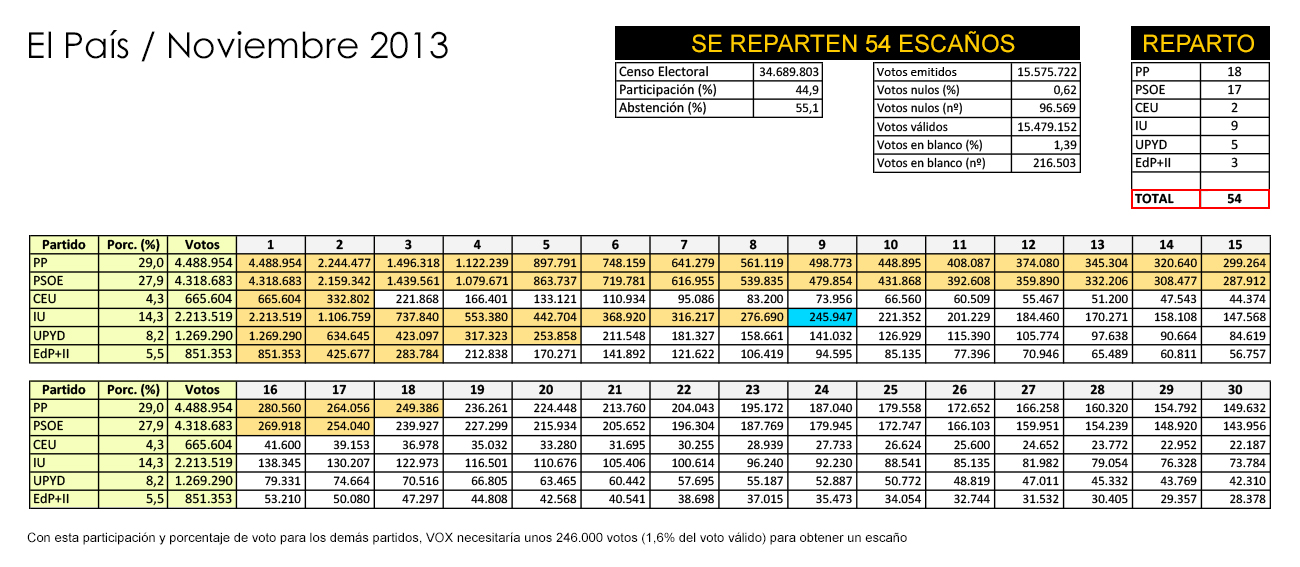 Para los porcentajes de votos, se han utilizado los que otorga el CIS encuesta de noviembre de 2013 (aunque hay que tener en cuenta que era un sondeo para unas supuestas Generales). Si se dieran estos resultados, los votos necesarios para sacar un escaño serían unos 245.000.