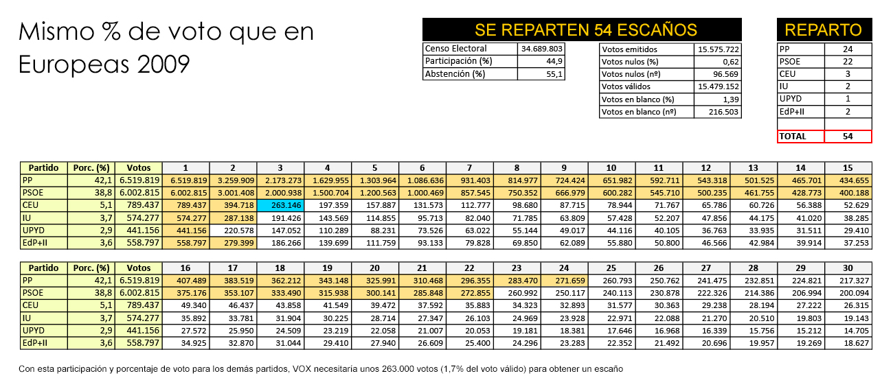 Para el primer supuesto, planteamos que el próximo 25 de mayo se produzca el mismo porcentaje de participación que en 2009 (el 44,9%) y de votos nulos y votos en blanco (0,62% y 1,39%, respectivamente). Además, utilizamos una distribución del voto válido equivalente a la de los pasados comicios europeos.