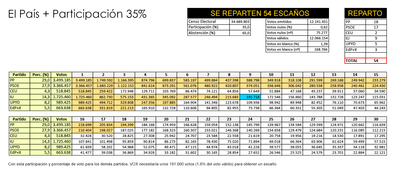 Con la misma metodología empleada hasta ahora, se ha diseñado un supuesto que se entiende que es el más favorable para los partidos minoritarios de cara a los próximos comicios. Así, se han escogido los porcentajes de votos obtenidos por las diferentes formaciones en la encuesta de El País, y se ha estimado una participación baja, del 35% (supondría un mínimo histórico en este tipo de comicios).
