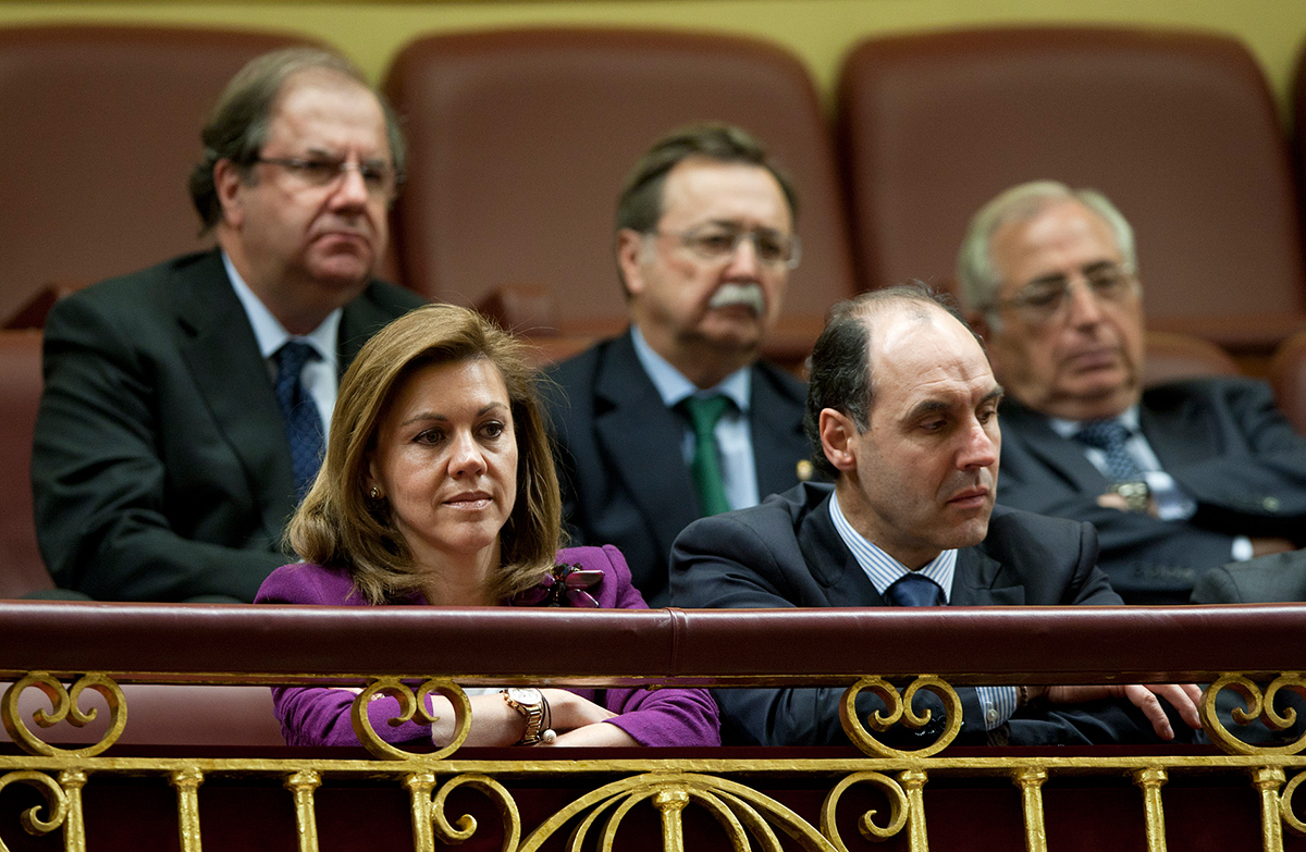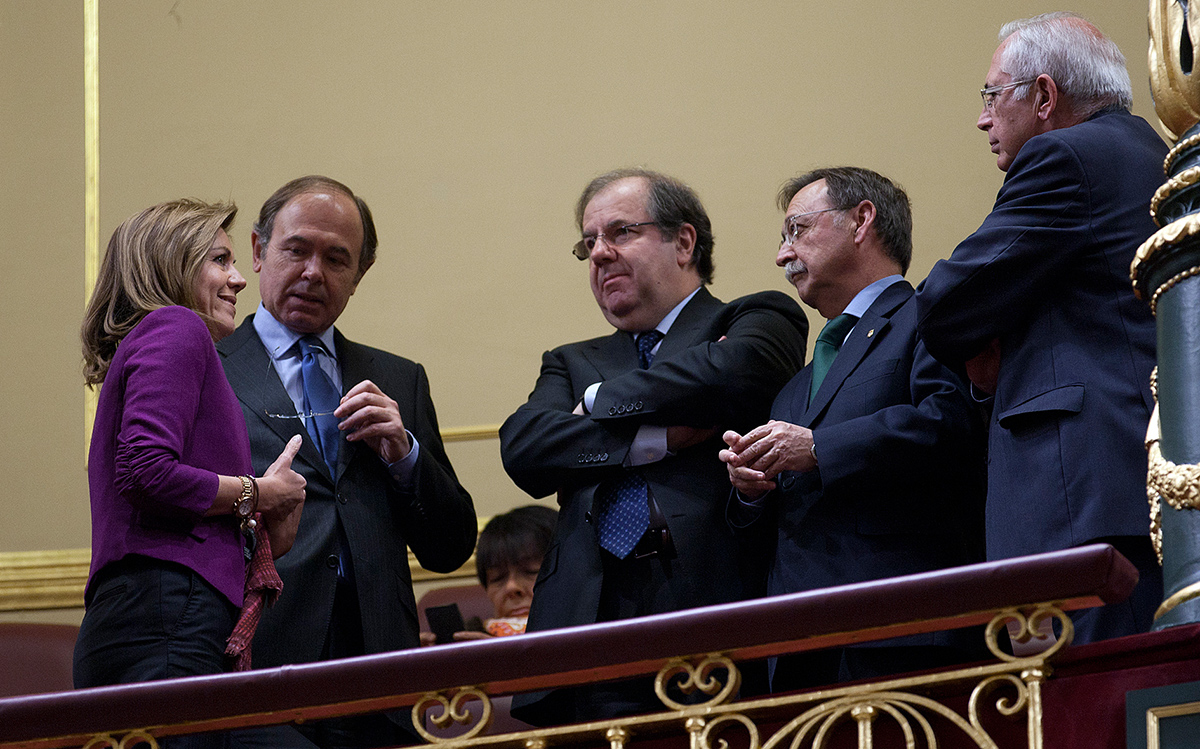 Vivas e Imbroda conversan con Pío García Escudero en la tribuna de invitados. Sentados, el presidente de La Rioja y el de la Comunidad Valenciana