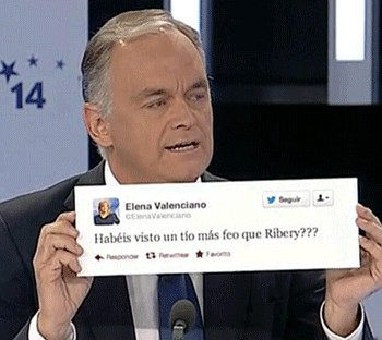 El popular exhibió un cartel con el tuit mientras argumentaba para defender a Cañete que "Elena tuvo un mal día" y que "todos podemos tener un mal día". Pidió no hacer "una categoría de lo que es una anécdota". Valenciano, después, le contestó en Twitter.
