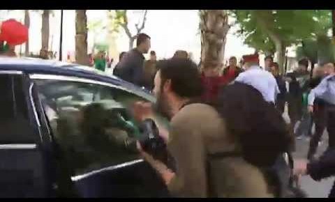Varias decenas de manifestantes anarquistas han atacado este miércoles el coche en el que el ministro de Hacienda, Cristóbal Montoro, y la líder del PP catalán, Alicia Sánchez-Camacho, salían del acto que ambos han protagonizado en Vilanova i la Geltrú por la campaña electoral de las europeas.