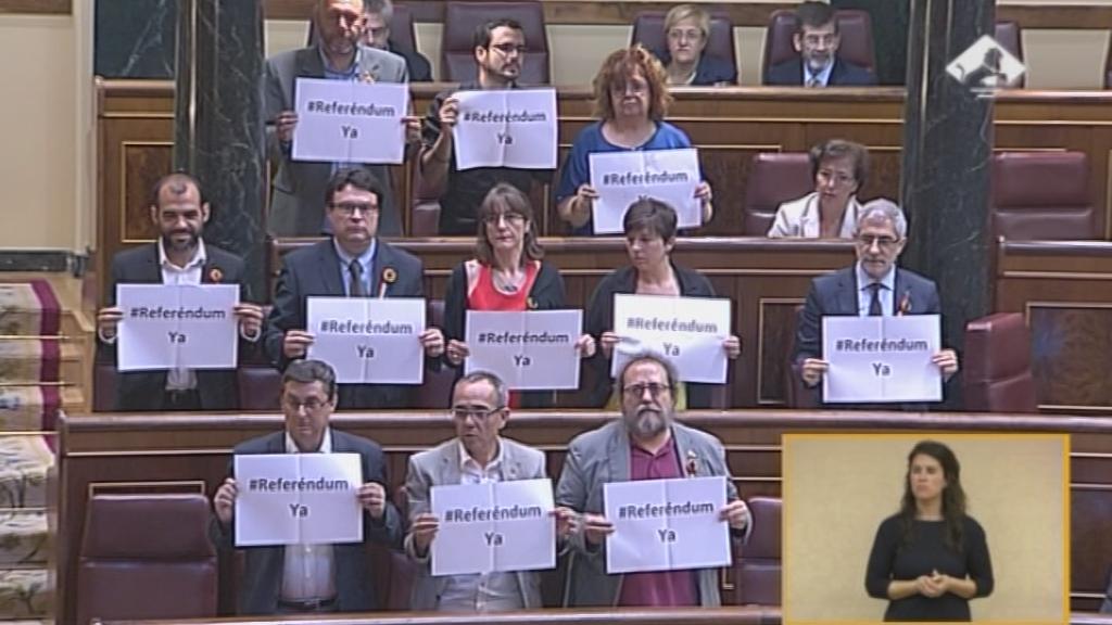 Los diputados agrupados en Izquierda Plural han pedido el referéndum sobre la monarquía aprovechando la intervención del líder de IU. El presidente del Congreso de los Diputados les ha tenido que llamar al orden para que retiren los carteles en los que se podía leer "#ReferéndumYa".