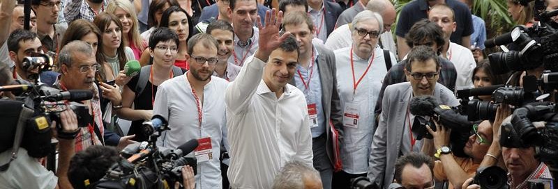Al filo del mediodía, acompañado por su mujer, Begoña Fernández, y con una amplísima sonrisa, hacia su entrada en el plenario el líder del PSOE, Pedro Sánchez, ovacionado por el medio millar de delegado presentes en el Hotel Auditorium de Madrid. Será "un congreso de unidad, de renovación, de cambio y de esperanza para España", proclamaba brevemente ante los medios de comunicación en medio de gritos y halagos.