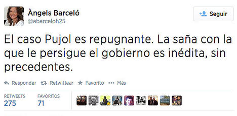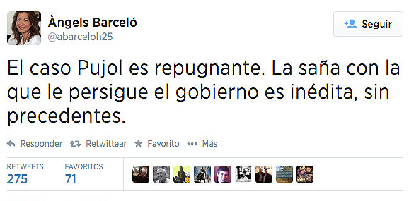 Además, la periodista comenzaba su tuit –que ha publicado durante la comparecencia de Montoro en el Congreso- señalando que "el caso Pujol es repugnante", pero como se puede ver por el resto del mensaje no se refería tanto a la evasión fiscal durante décadas del de CiU, sino a la presunta persecución del Gobierno.