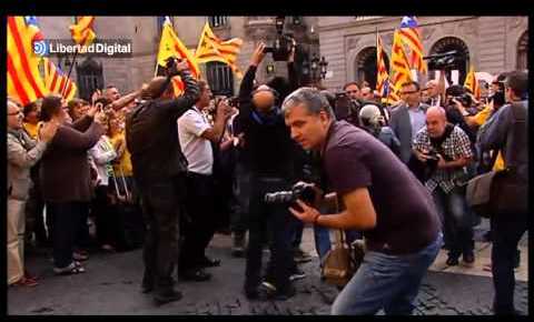 Cientos de personas se concentraron en la Plaza de San Jaime de Barcelona para dar la bienvenida a Artur Mas y al resto de personalidades que acudieron al acto de la firma de la convocatoria del referéndum ilegal. La plaza estaba llena de esteladas y de mensajes a favor de la secesión mientras el ambiente era de éxtasis entre los presentes.