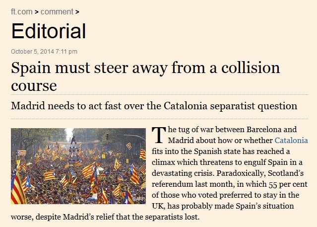 Para Financial Times "el tira y afloja entre Barcelona y Madrid sobre Cataluña amenaza con hundir a España en una crisis devastadora". En este sentido, recuerda el referéndum separatista en Escocia y dice que podría haber "hecho que la situación de España empeore, pese al alivio inicial del Gobierno de Madrid por la derrota de los separatistas escoceses". Por otro lado, FT reconoce que la Constitución Española "consagra la indisoluble unidad del Estado español y la mayoría de los estudios coinciden en que el referéndum sería ilegal bajo las leyes españolas". El problema, sigue este diario, es que Cataluña se está convirtiendo "rápidamente" en un conflicto identitario "venenoso" que puede terminar "sin ganador alguno". Para FT, "la intransigencia de Madrid y el aventurismo de Barcelona se traducirá en un choque de trenes".