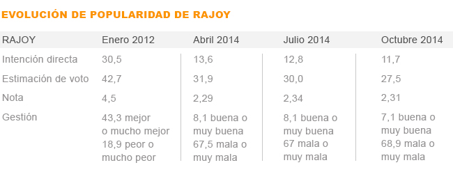 Si echamos ahora un ojo a la caída de popularidad en la legislatura de Mariano Rajoy los datos asustan ya que pulveriza la marca de Zapatero. Desde enero de 2012 hasta octubre de 2014, Mariano Rajoy se ha dejado el 15,2% de apoyo en el camino.