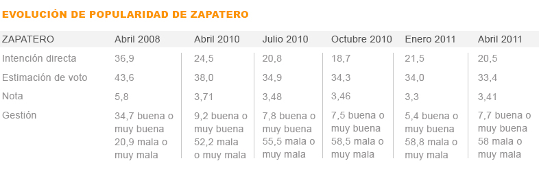 Si comparamos los barómetros del CIS sobre intención de voto entre abril y octubre de 2010, tras aquel mayo en el que España estuvo a punto de suspender pagos y obligó al presidente del Gobierno a tomar medidas que iban diametralmente en contra de lo que había prometido, Zapatero y su gobierno perdieron muchísima popularidad. Tanto es así que entre abril y octubre de aquel año 4,3 puntos en estimación de voto. Pero Zapatero apenas cayó en popularidad en el CIS ya que pasó de obtener un 3,71 de nota media entre los ciudadanos al 3,46. Eso sí, bajó en casi dos puntos la valoración de su gestión pasando del 9,2 al 7,5 por ciento. Por otro lado, se disparó en 6,3 puntos el número de aquellos que consideraban que era mala o muy mala: del 52,2 al 58,5.