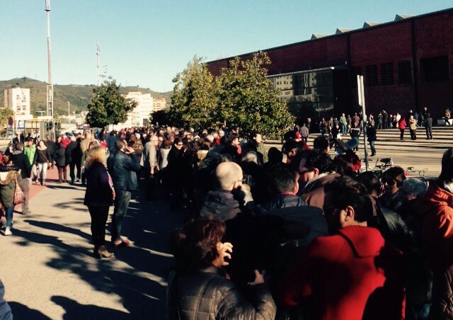 En la retina de los presentes, la imagen de un acto de masas en Barcelona sin la omnipresente estelada y la sensación de privilegio ante la cantidad de personas que no pudieron acceder al recinto. Mucha gente hacía cola a las puertas del recinto en la idea de que aún no se habían abierto cuando en realidad ya no cabía casi nadie más en el pabellón. Los miembros de los círculos de Podemos en diversas localidades catalanas habían copado las gradas y las sillas de platea del polídeportivo. Y lucían sus enseñas, pancartas moradas con el símbolo del partido, la palabra Podemos y la localidad respectiva, de todas las provincias catalanas. La policía autonómica reclamó a un miembro de la organización que saliera fuera y con un megáfono instara a desistir a los que pretendían entrar.