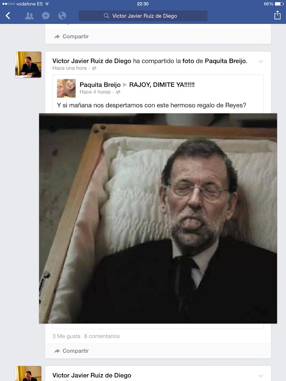 En el comunicado, adjuntan una captura de pantalla en la que se puede ver cómo desde el perfil de Ruiz de Diego en Facebook se compartía un fotomontaje publicado por otra usuaria de esta red social, donde puede verse al presidente del Gobierno con los ojos cerrados y la lengua fuera yaciendo en el interior de un ataúd. El montaje fotográfico viene acompañado de la siguiente leyenda: "¿Y si mañana nos despertamos con este hermoso regalo de Reyes?".
