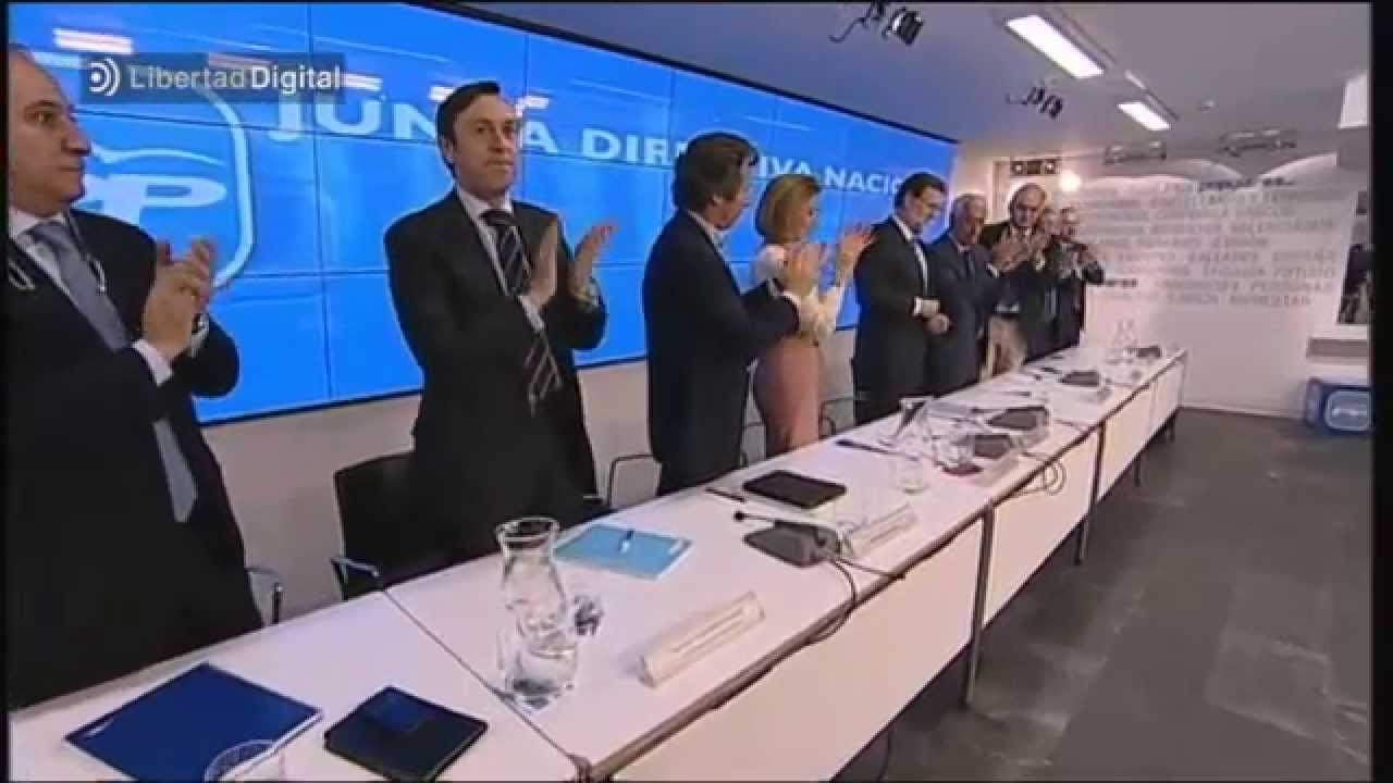Tras la intervención de Rajoy y la ovación de los presentes se ve cómo la Junta Directiva Nacional se sienta por lo que puede parecer que iba a comenzar un turno de réplica que no hubo.