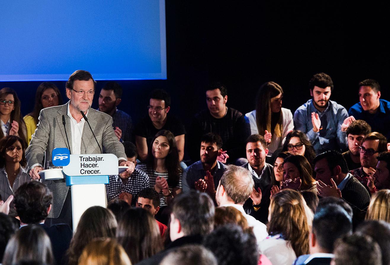 En síntesis, para Rajoy, votar a cualquier otra formación que no sea el PP atraerá los nubarrones de antaño y pondrá en peligro la creación de empleo, que prometió que irá a más en los próximos meses. "España necesita un futuro en el que no puede haber frivolidades, ni se pueden tomar decisiones, como quieren algunos, sin ni siquiera pensar", volvió a atacar en otro momento de su intervención.