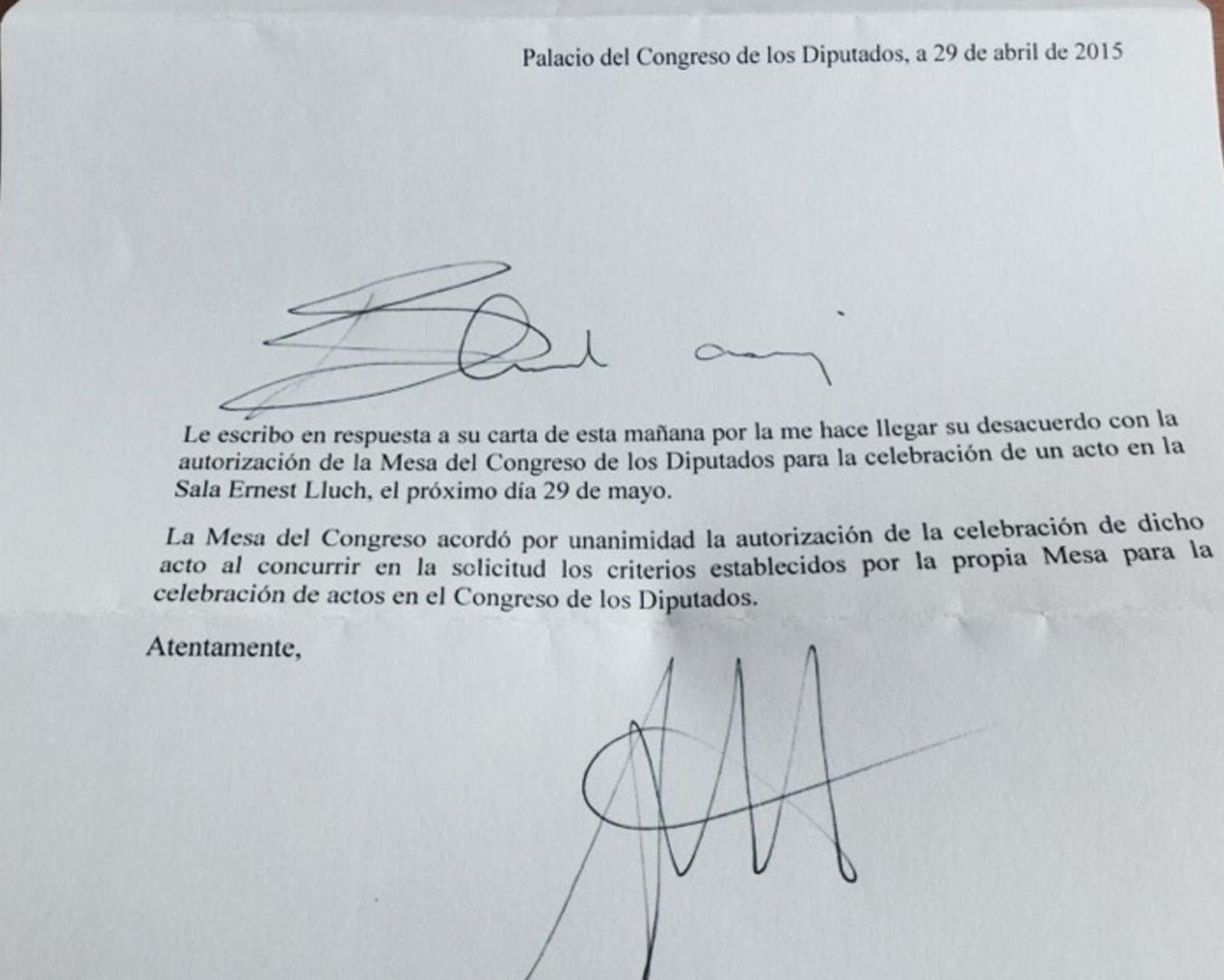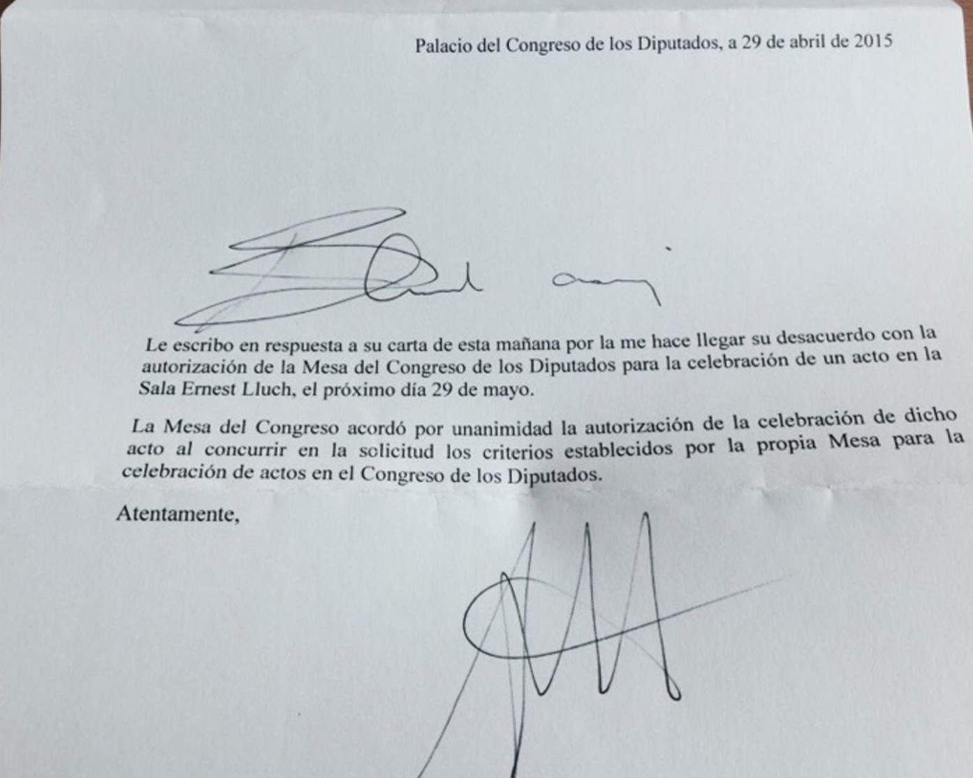 Lejos de recular, la respuesta del presidente Posada ha sido la que mostramos en este documento al que ha tenido acceso Libertad Digital. Una carta remitida por Posada a un diputado en la que el presidente apela a la "unanimidad" en la autorización del acto, y a que los grupos solicitantes cumplen con "los criterios establecidos por la propia Mesa para la celebración" de este tipo de eventos en la sede de la soberanía nacional.