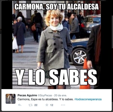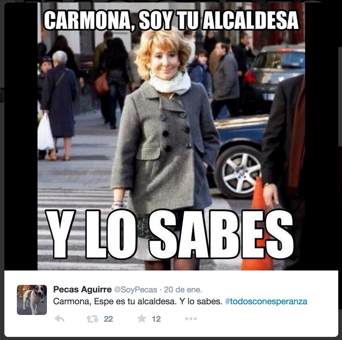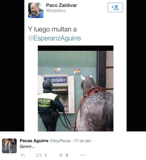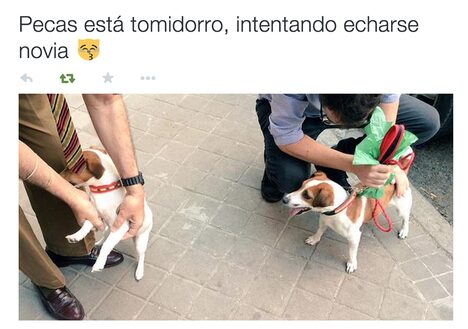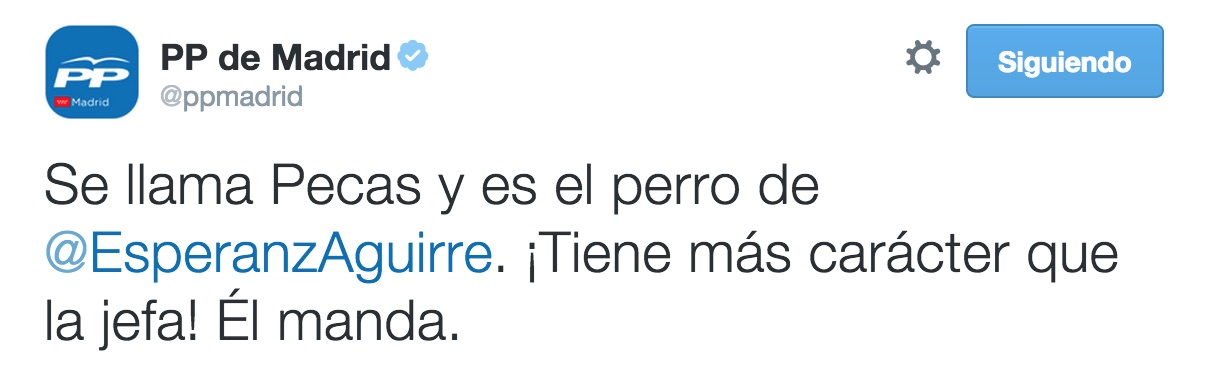 El PP de Madrid ha tuiteado varias fotos del "dog-encuentro". Así presentaba al invitado estrella en Twitter: "Se llama Pecas y es el perro de @EsperanzAguirre. ¡Tiene más carácter que la jefa! Él manda". Otro de los mensajes era de alto contenido erótico: "Pecas está tomidorro, intentando echarse novia". Los que antes molestaban a Pecas debían de ser machos.