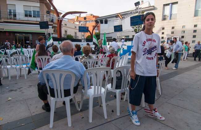 En cada uno de los asientos se coloca una bandera de Extremadura, aunque ya antes del mitin muchas de ellas acaban en destinos insospechados: las ondean los niños subidos al parque de juegos cercano, o dos chavales que se pasean por la plaza con su skate. Luego, una vez en marcha el mitin los asistentes tampoco es que les hagan mucho caso, todo hay que decirlo.