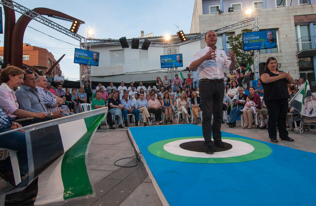 Por fin llega el momento estelar: Monago va a hablar, se retira el pequeño atril y se queda el presidente de pie, con uno de esos micros que se sujeta sólo junto a la boca y sin papeles. Y empieza el discurso. ¿Discurso? No exactamente, Monago habla y habla y habla pero parece más una conversación que un discurso; una conversación en la que sólo interviene él, claro, pero que parece fluir como si alguien le estuviese preguntando: oye, cómo ves lo de Podemos, qué te preocupa, habrá pacto después de la votación… De hecho, en la mayor parte de los mítines de la campaña se aceptan preguntas del público al final, aunque en este no se hará porque hay un considerable retraso.