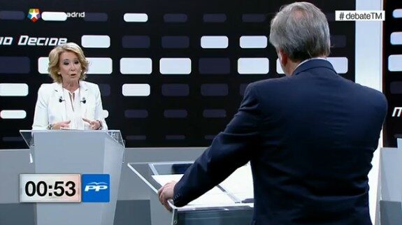 Esperanza Aguirre defendió un Madrid moderno que se mire en el espejo de Nueva York o Londres. Pero sobre todo instó a aumentar la "libertad, esa palabra que a los socialistas y bolivarianos les da alergia". Por su parte, Carmona comenzó muy agresivo y denunció la "trayectoria siniestra de Aguirre" y citó el tamayazo, la Gürtel, Bárcenas, Rato..."No debería pedir el voto sino pedir perdón", le espetó el socialista.