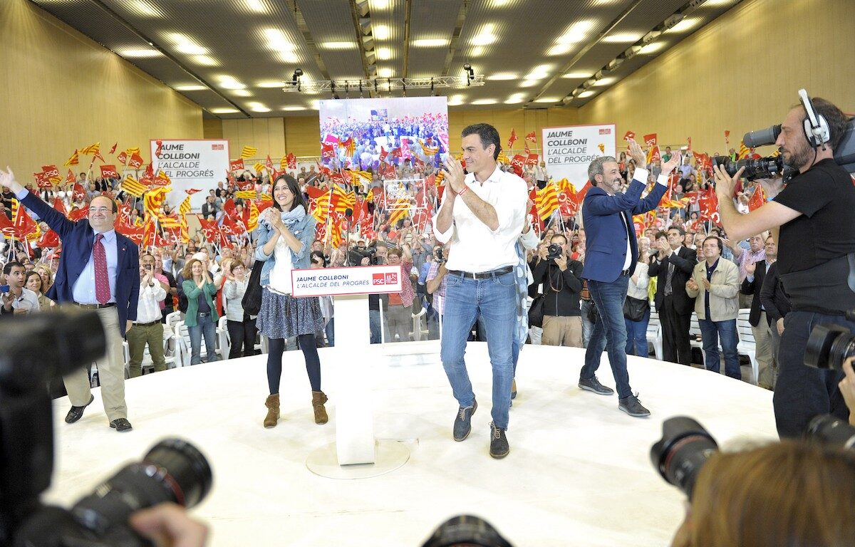 Es la única comunidad autónoma en la que no sonaba la sintonía del PSOE. A ritmo de Jump, de Van Halen, hacía su entrada el secretario general del PSOE, Pedro Sánchez, junto al primer secretario del PSC, Miquel Iceta, y el candidato a la alcaldía de Barcelona, Jaume Collboni. Un primer síntoma del trato diferente que se permite el PSOE con el partido hermano, el PSC, de quien siempre recuerdan "es otro partido" con sus propios estatutos.